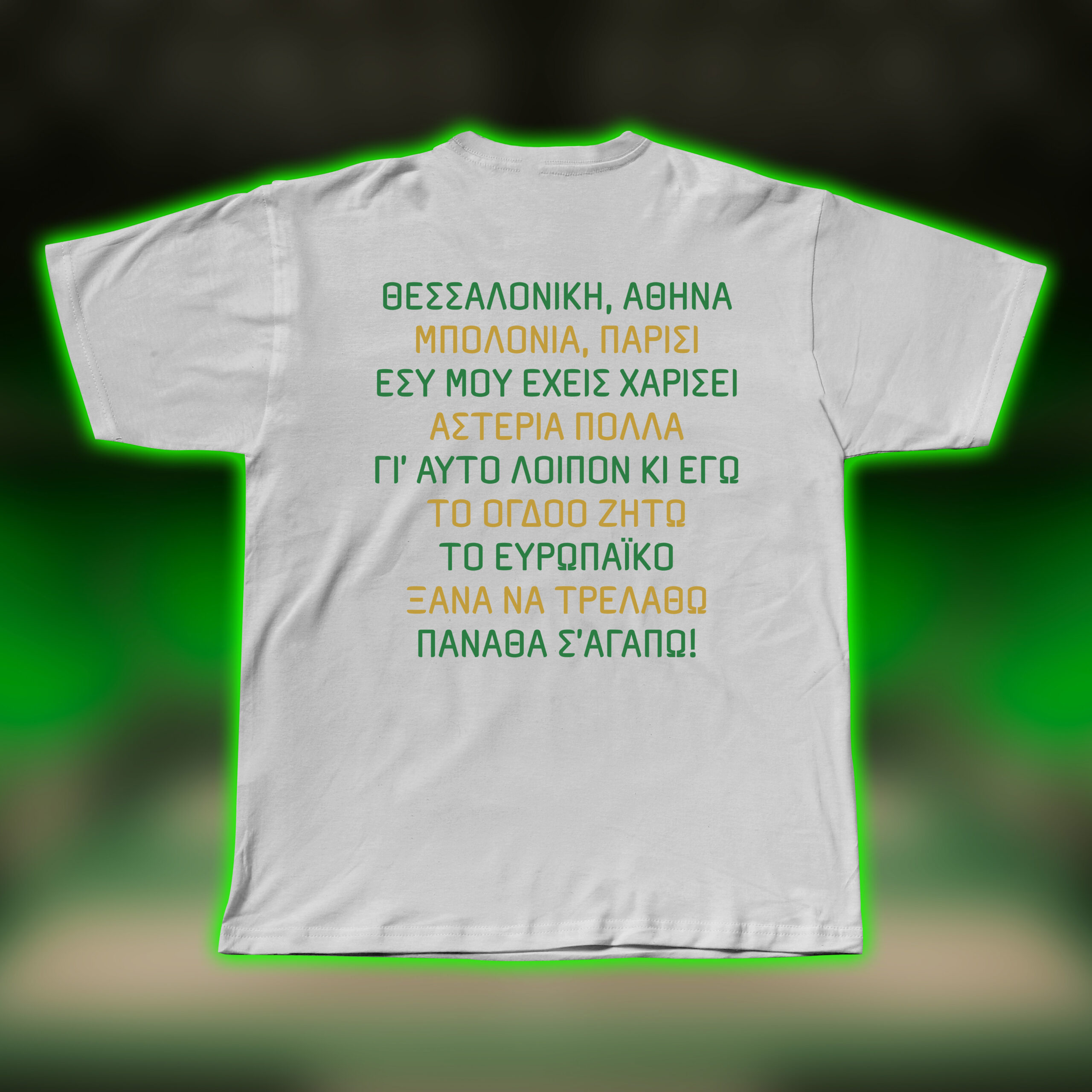 Premium t-shirt κατασκευασμένο από 100% ποιοτικό βαμβάκι, προσφέρει άνετη εφαρμογή και φυσική αίσθηση στο σώμα. Μοναδικό και ξεχωριστό σχέδιο με σύνθημα της αγαπημένης σου ομάδας σε μαύρο, άσπρο ή σκούρο πράσινο χρώμα για να διαλέξεις!